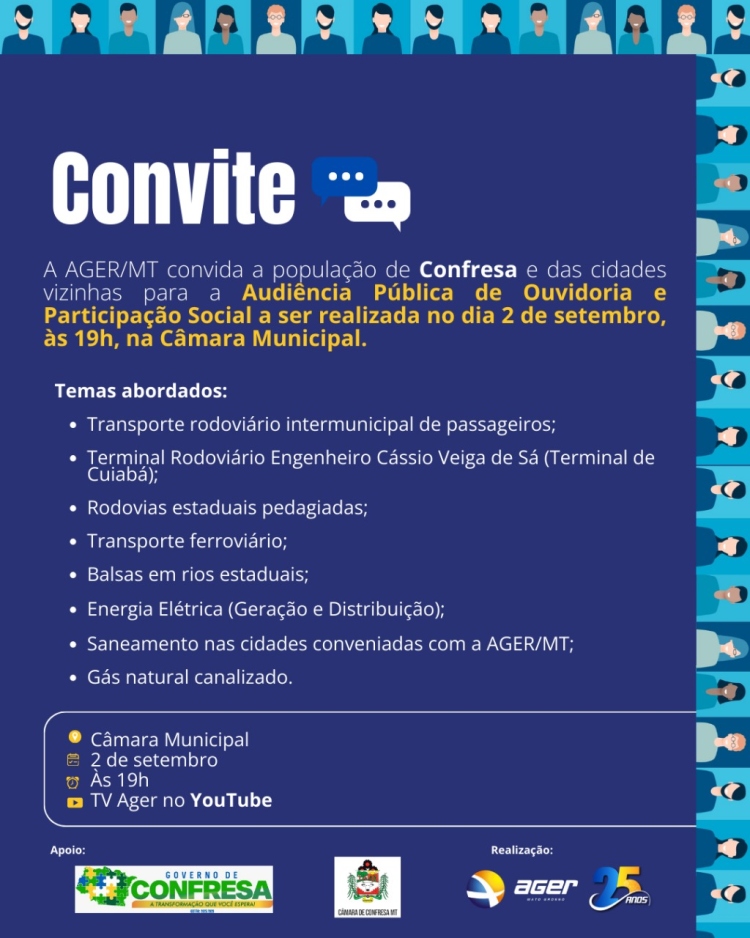 ✨📢 Atenção, comunidade! 📢✨  A Câmara Municipal convida toda a população para a Audiência de Ouvidoria e Participação Social da AGER-MT 🏛️, que acontecerá no dia 02/09 às 19 horas ⏰.  🙌 Sua presença é fundamental! Cada cidadão pode ajudar a mudar e melhorar nossa cidade 🌟. Juntos somos mais fortes 💪💙! ✨📢 Atenção, comunidade! 📢✨ A Câmara Municipal convida toda a população para a Audiência de Ouvidoria e Participação Social da AGER-MT 🏛️, que acontecerá no dia 02/09 às 19 horas ⏰. 🙌 Sua presença é fundamental! Cada cidadão pode ajudar a mudar e melhorar nossa cidade 🌟. Juntos somos mais fortes 💪💙!